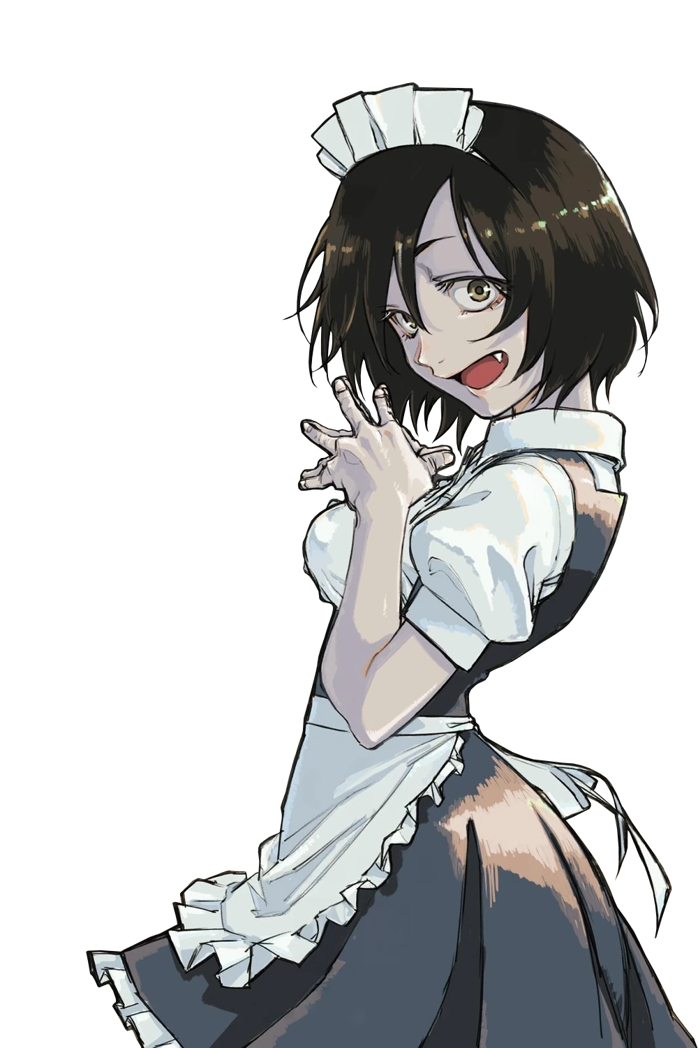 Like her fellow vampires, Midori is highly attractive with a cuteness that makes her very popular in her café, both among the guests and her fellow maids. She has short, dark-brown hair, along with large, coffee-brown eyes. Within her irises, the color becomes lighter around her pupils. Her pupils are also white. Even when pretending to be a human, her mouth often displays one singular fang, a popular trope in moe culture.